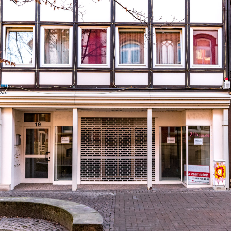 Was heute aussieht wie ein modernes Gegenstück zu dem spätmittelalterlichen Fachwerkbau mit Toreinfahrt als direkter Nachbar, entpuppt sich in Wirklichkeit als ein Gebäude mit zwei „Doppelhaushälften“. Genauer: Ursprünglich bildet Nr. 19 zusammen mit Nr. 17 ein einziges Baugrundstück, wohl bereits seit den 1530er Jahren. Spätestens nach dem Stadtbrand 1545 wird es 1556 gleichzeitig mit zwei Häusern von Hans Niemeier neu bebaut. Wohl gegen 1589 ist ein C. Dortmunden der letzte, der Nr. 17 und Nr. 19 gemeinsam besitzt/bewohnt. – Auf jeden Fall ist Nr. 19 seinerzeit wohl eine Art „Zwilling“ zu Nr. 17, ebenfalls mit Sonnenrosen (Fächerrosetten) und Tor. Schmuck und Balkenlage haben direkten Anschluss an das Nachbarhaus, woraus man schließen kann, dass beide Häuser ursprünglich eine Einheit bilden. Auch der abgeschnittene Halbkreis von Nr. 17, der plötzlich an der Fassade von Nr. 19 endet, weist darauf hin, dass sich dieser in einer Linie seinerzeit auf der Fassade von Nr. 19 fortsetzt.